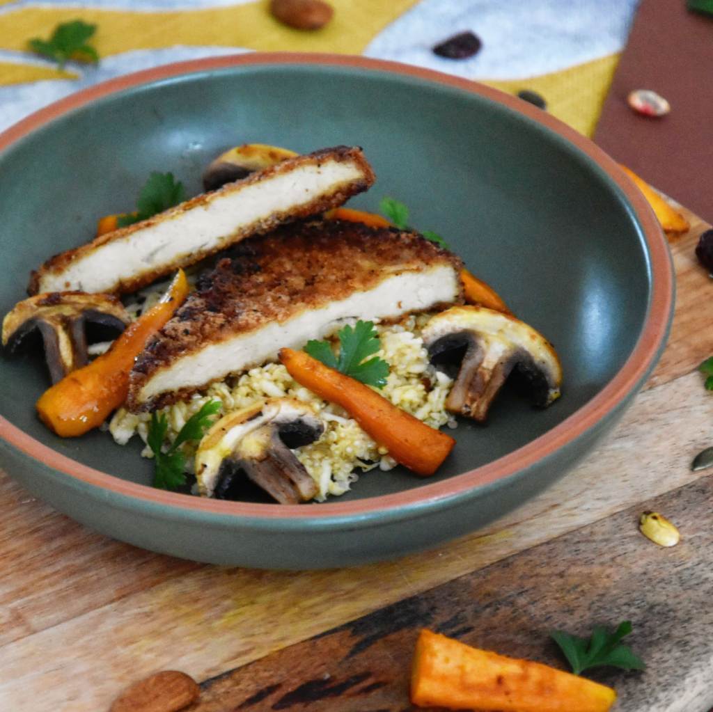 Amis végétariens et vegan nostalgiques de l’escalope milanaise pour sa panure, je vous propose cette recette de Tofu fumé pané ! Accompagné de quinoa et de légumes croquants de saison, un plat gourmand et responsable !